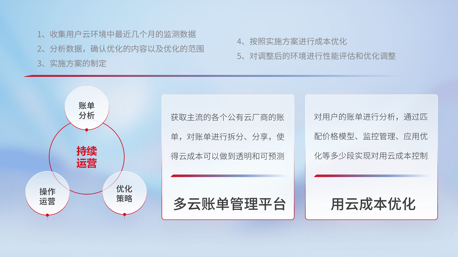 通过多云纳管,,,,以统一的资源数据模型把客户的云资源进行抽象和封装,,进而实现对多云资源的统一操作,,,,保障云资源管理的可靠性、、、稳定性与可用性。。量身定制化运维内容,,配置、、、、开发运维、、、、补丁管理、、、备份、、、监控、、、认证和访问管理、、审计和日常巡检等,,,保障在用云过程中的可靠度,,,稳定度以及高可用率。。。